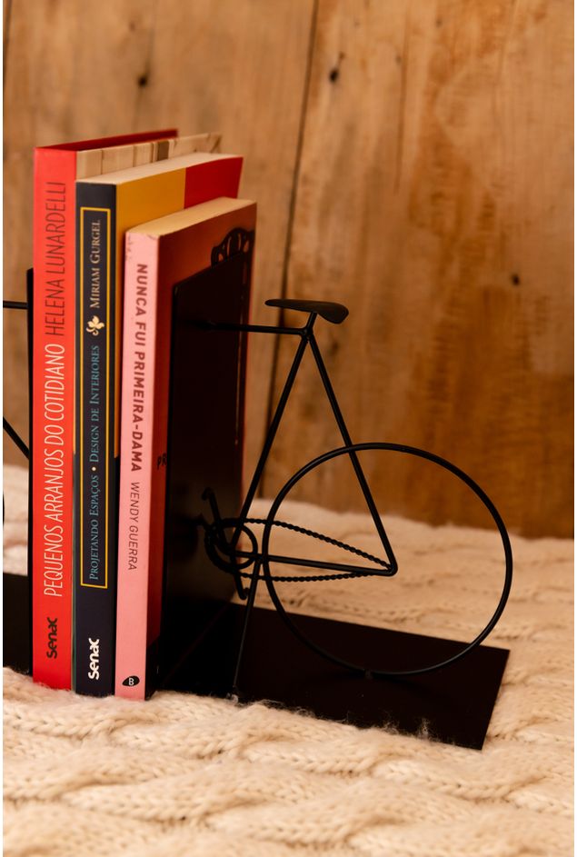 Aparador de livros em formato de bicicleta, feito de metal na cor preta em processo manual. Ele possuí duas peças sendo a parte da frente e a parte de trás da bicicleta. Juntas elas formam o design completo, perfeito para organizar e decorar a sua prateleira de livros!
