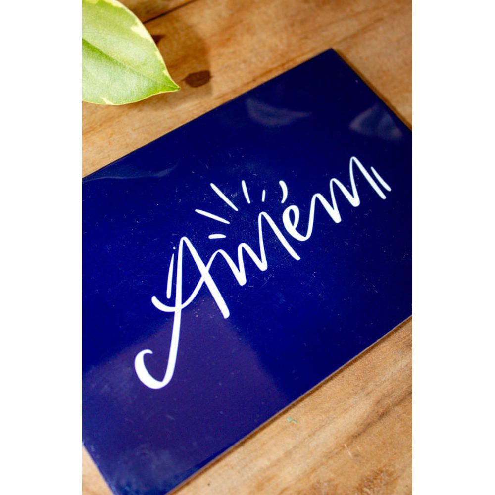 Design limpo com uma palavra poderosa. O azulejo (Amém) traz fé e simplicidade em uma peça elegante e atemporal.