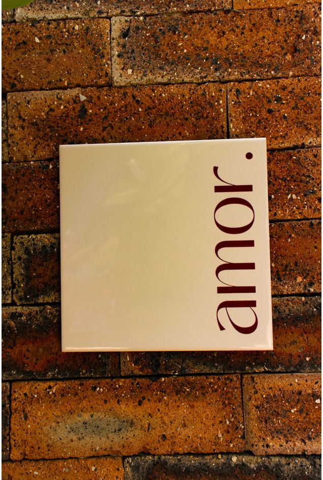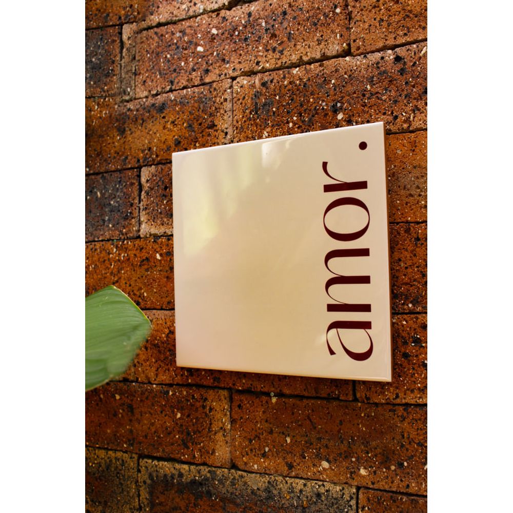 Azulejo decorativo com a palavra (Amor), em tom vinho, uma peça romântica e elegante transmitindo uma declaração visual que fala por si só. A palavra em composição vertical e tipografia sofisticada ganha destaque sobre o fundo neutro, tornando a peça uma escolha perfeita para quem valoriza afeto e estética em cada detalhe da decoração do lar.