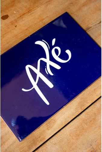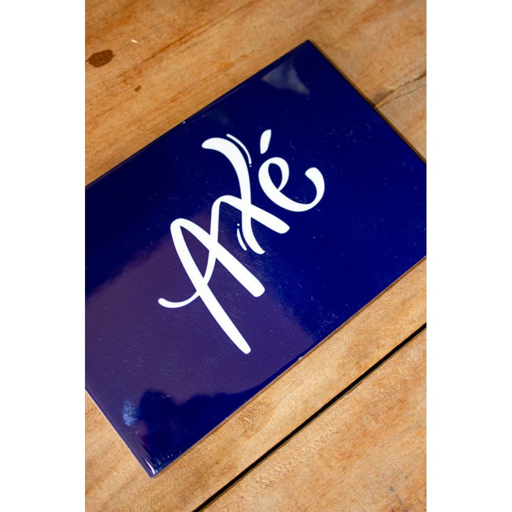 Este azulejo traz a palavra que simboliza energia, proteção e conexão com o sagrado, em um design marcante com fundo azul intenso e caligrafia fluida em branco. Um convite à vibração positiva em qualquer espaço.
