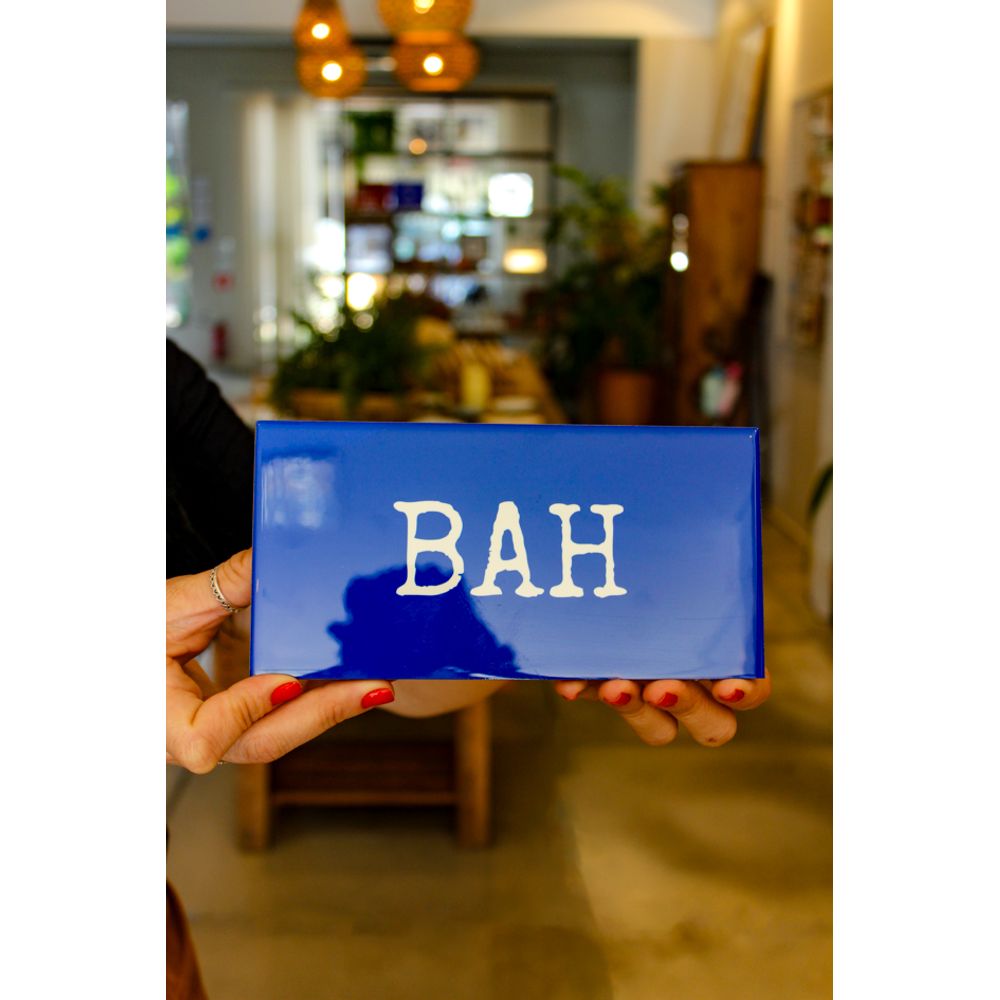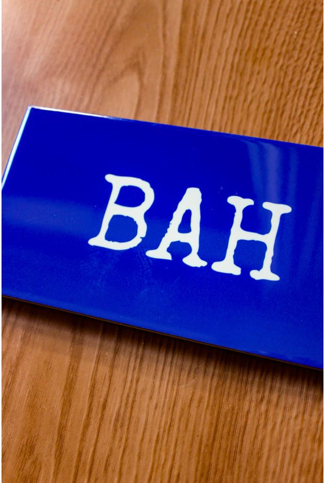 Azulejo decorativo com a palavra (Bah), expressão muito utilizada no sul, o ponto está na intensidade do bah, que muda totalmente com a entonação, como forma de admiração ou indignação, uma palavra curinga no dia a dia, a peça decorativa que transforma a sua decoração com brasilidade e memória, celebrando sotaques e histórias.