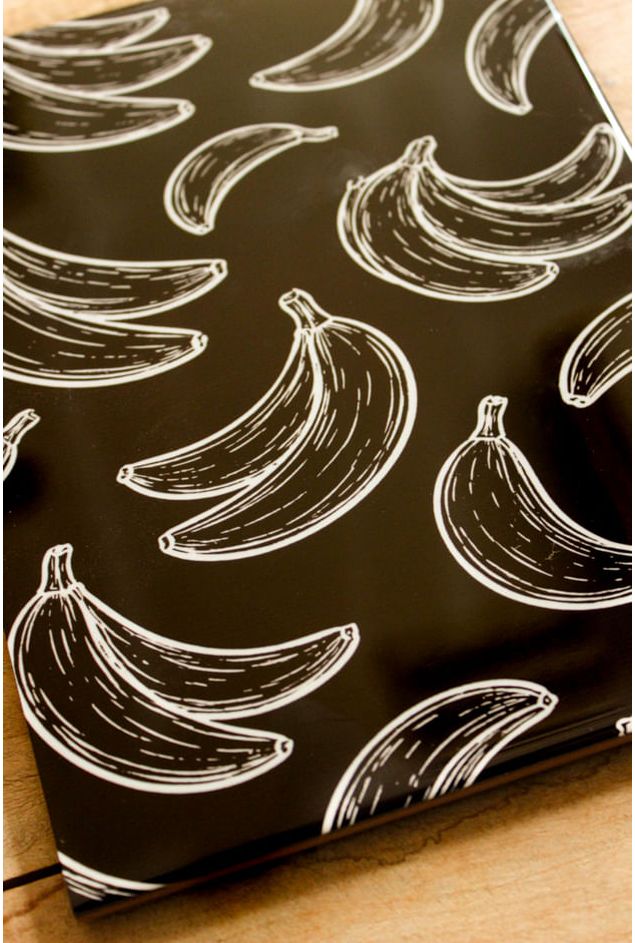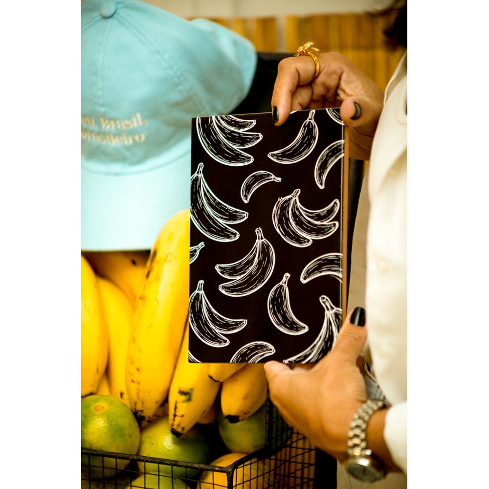 Azulejo decorativo com estampa de bananas em traço branco sobre o fundo preto intenso, destacando as delicadas bananas, uma arte que mistura brasilidade e o minimalismo, a composição transmite leveza e movimento, uma obra artística, moderna e cheia de personalidade. Perfeito para pendurar em paredes criativas, ou presentear alguém especial.