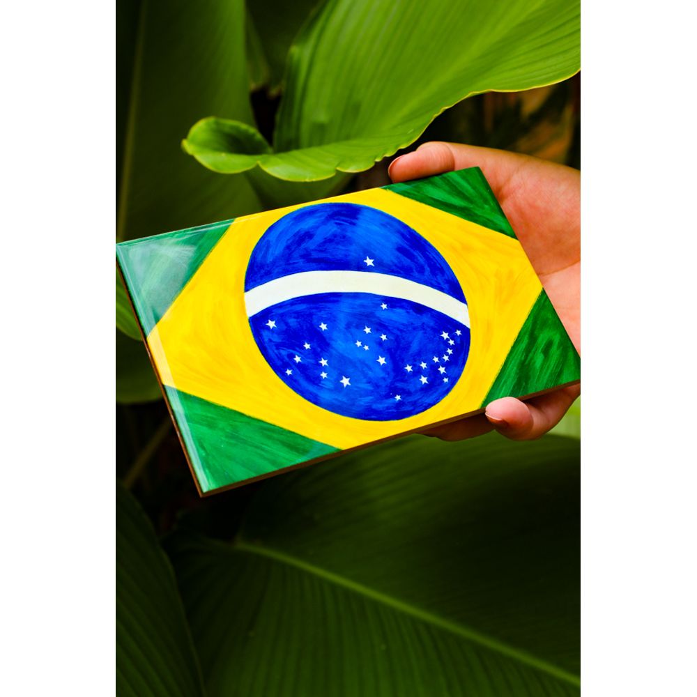 Azulejo decorativo com a identidade brasileira, estampado com a nossa linda bandeira do brasil, como uma bela obra de arte. A peça foi desenvolvida em tons quentes para transmitir a cor e a alegria de nosso país, belo destaque para a decoração de sua parede, além de um mimo perfeito para presentear aquela pessoa especial que mora fora do brasil, uma forma de trazer mais para perto.