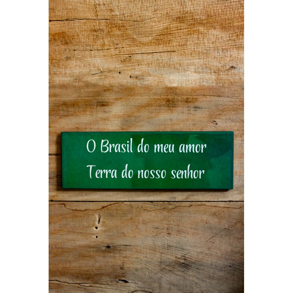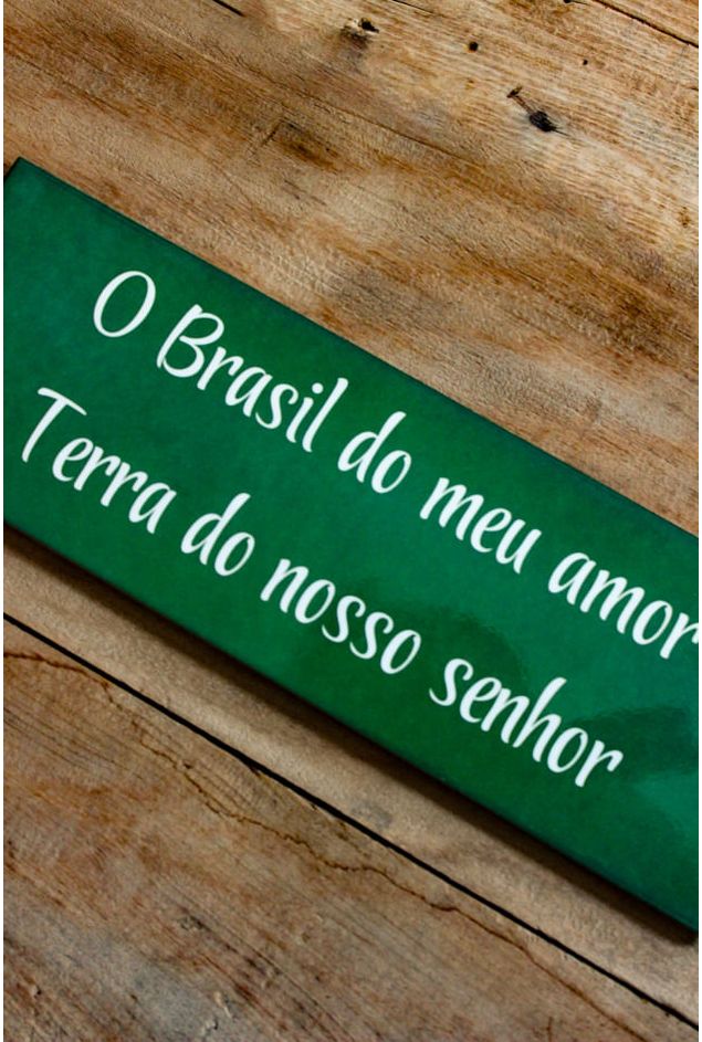 Azulejo decorativo em formato retangular, com a frase (O brasil do meu amor terra do nosso Senhor), um trecho icônico da música – aquarela do brasil, de Ary Barroso, escrita em letras brancas sobre o fundo em tom verde, uma peça decorativa repleta de poesia e musicalidade, para decorar com a energia brasileira. Uma peça artística pensada em transmitir cor e alegria.