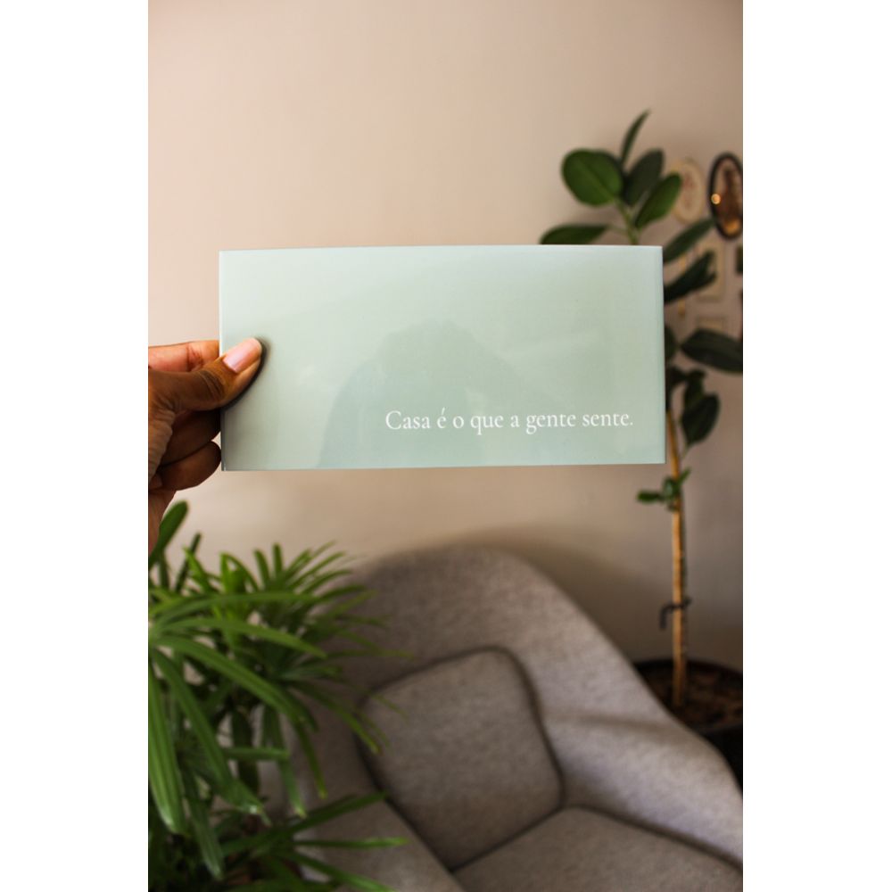 Azulejo decorativo com a inspiradora frase (Casa é o que a gente sente) uma peça artística delicada em tom verde neutro, com escrita em branco, seu design minimalista transmite conforto e sofisticação para o ambiente, um mimo que transforma a sua parede decorativa com afeto e delicadeza.