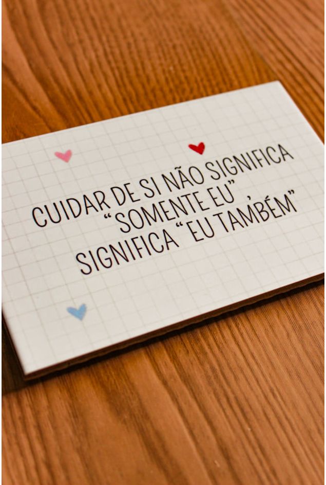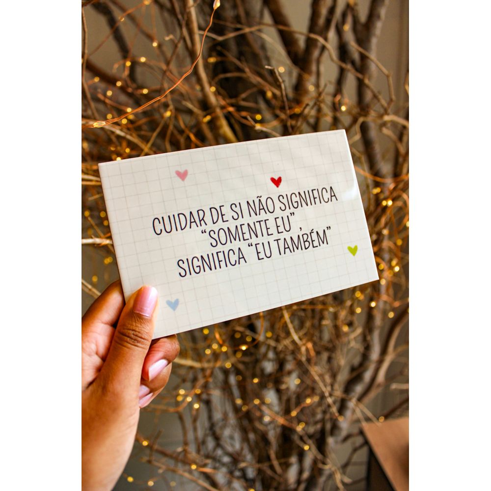 Azulejo decorativo com a frase (Cuidar de si não significa ‘somente eu’, significa ‘eu também’). Uma peça delicada com frase inspiradora, criada para lembrar que o autocuidado não é excesso, mas faz parte essencial de uma vida mais gentil consigo mesma. Uma peça com design leve e fofo, com fundo quadriculado sutil e pequenos corações coloridos, o que traz doçura e reflexão na medida certa, transformando a mensagem em um detalhe afetivo para a decoração.