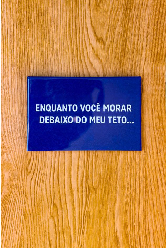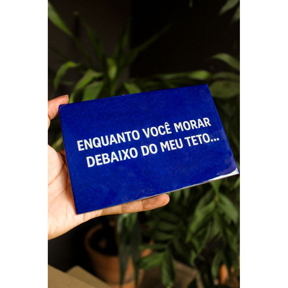 Azulejo decorativo com a frase (Enquanto você morar debaixo do meu teto). Uma frase inspirada no universo materno. Com fundo azul intenso e letras marcante, o azulejo transforma uma frase tão conhecida em um item decorativo com memórias afetivas, perfeito para presentear com um bom humor e descontração.