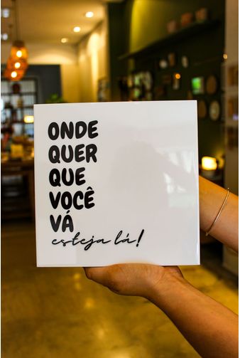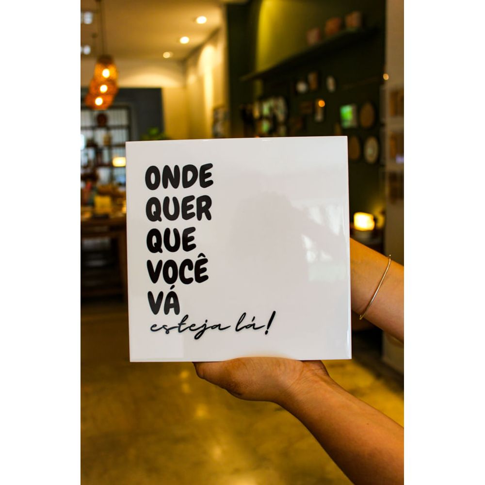 Azulejo decorativo com a frase (Onde quer que você vá, esteja lá). Uma mensagem poética de que estar presente de verdade, é o maior presente. Com letras marcante em preto, a peça ideal para pendurar na parede como uma inspiração de propósito e conexão com o agora.