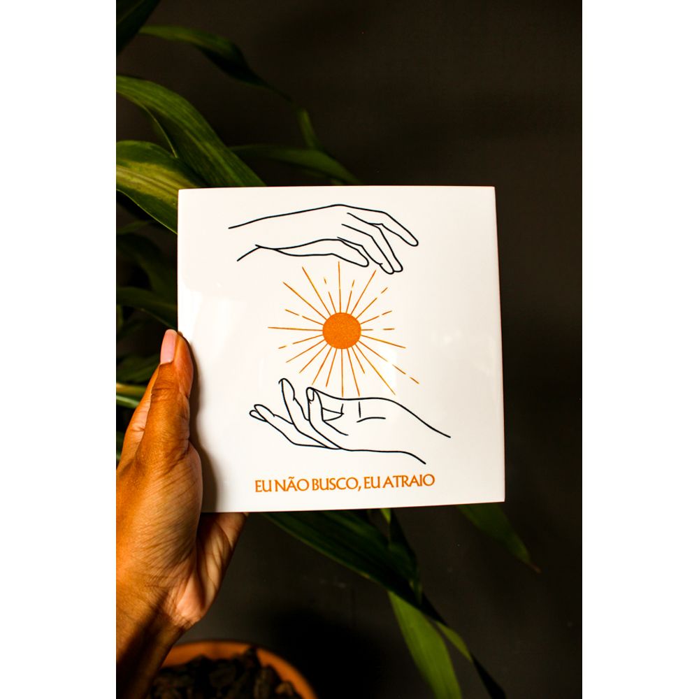 Com traços finos e toque dourado, a peça transmite a leveza da confiança e o poder da intenção. As mãos abertas envolvem um sol radiante, símbolo de energia e magnetismo. Uma arte que inspira conexão com o que é essencial e abundante.