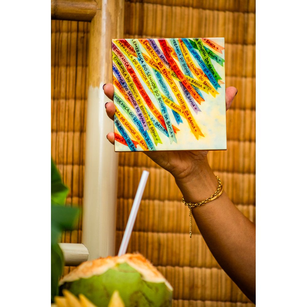 Azulejo decorativo com a estampa que carrega fé e tradição em cada detalhe, composta pelos desenhos das fitinhas do senhor do Bonfim, uma explosão de cores criando movimento e significado, peça artística inspirada na cultura brasileira simbolizando proteção e esperança. O mimo perfeito para presentear ou pendurar na parede como forma de esperança diária.