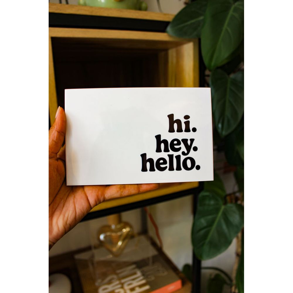 Azulejo decorativo com tipografia descolada e marcante em tom preto, que se destaca sobre o fundo branco, uma peça minimalista repleta de estilo, com a frase (Hi hello hey) o que torna a peça perfeita para ambientes que recebem com charme e descontração, o mimo perfeito para presentear ou pendurar na parede com estilo