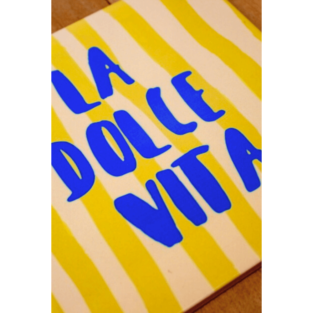 Colorido, alegre e cheio de charme, o azulejo “La Dolce Vita” é um convite para apreciar os pequenos prazeres da vida. As listras verticais em amarelo suave criam um fundo vibrante para a tipografia em azul intenso, trazendo frescor e um toque mediterrâneo à peça. Ideal para quem deseja decorar com personalidade e leveza.