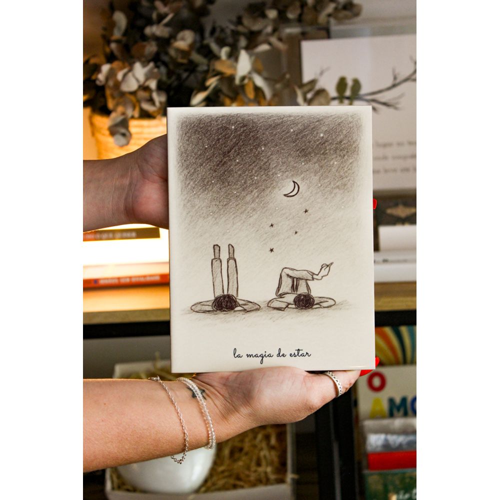 Azulejo decorativo com ilustração como rabiscos em grafite de duas figuras deitadas observando o céu que contém pequenas estrelas e lua, comtemplando a sua beleza como companheiros em um momento de descanso, a composição acompanha a frase (La magia de estar) frase em espanhol que se traduz em (A magia de estar). Uma verdadeira poesia inspirando conexão entre dois corpos que se permitem desacelerar sob as estrelas do anoitecer.