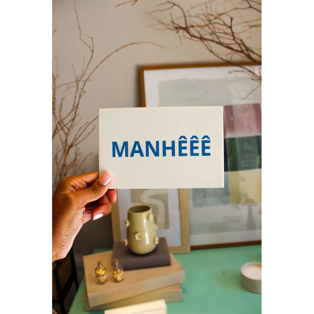 Azulejo decorativo com a palavra (Manhêêê). Uma peça cheia de humor, inspirada naquele chamado que atravessa memórias, rotinas e a intimidade de casa. Com letras marcantes em azul intenso, o azulejo transforma uma expressão do dia a dia em um detalhe de decoração leve, e descontraída. Perfeito para decorar com boas memórias e para presentear com carinho, especialmente quem entende que esse chamado carrega amor e colo.