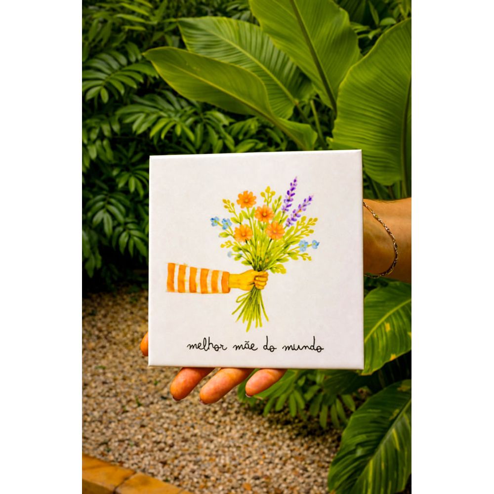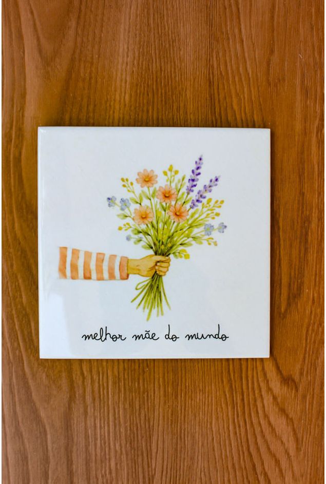 Azulejo decorativo com a frase (Melhor mãe do mundo). Uma peça delicada e cheia de afeto, que transforma um gesto simples em uma homenagem inesquecível para uma mãe. A figura com o buquê de flores bem coloridas se destaca nas mãos que o segura, uma forma de admiração e a beleza de presentear com um mimo, quem floresce a vida com amor todos os dias. Uma peça com design leve e sensível, este azulejo decorativo é perfeito para emocionar no Dia das Mães e levar mais poesia, cor e significado para a decoração.