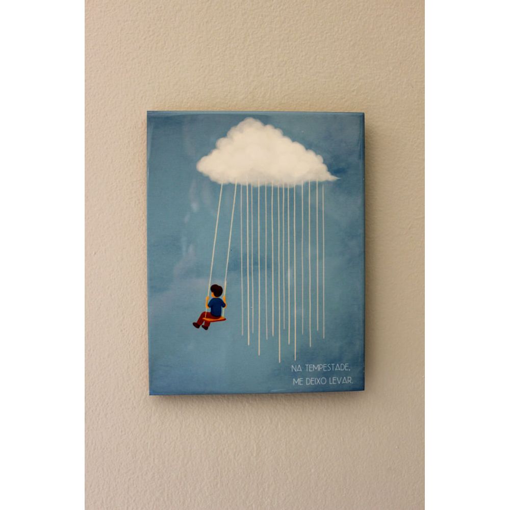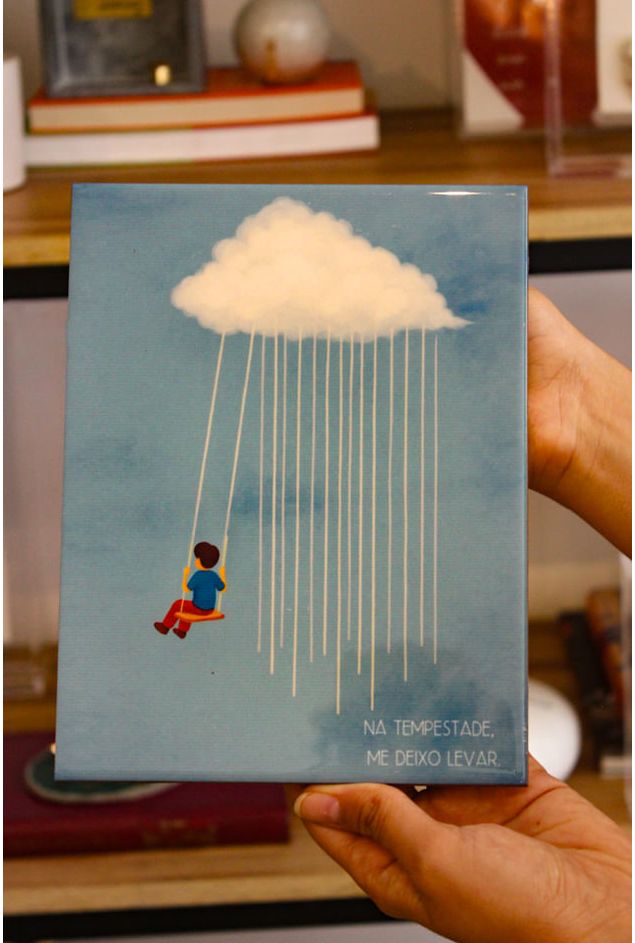 Um verdadeiro encanto! o azulejo decorativo apresenta um menino balançando pela corda de uma nuvem-chuva, em formato aquarela, enquanto a frase no canto em tom branco (Na tempestade, me deixo levar). Nos convida à entrega, à leveza e à confiança no fluxo da vida misturando sensibilidade, arte e afeto. Perfeito para decorar um quarto cheio de afeto e alegria.