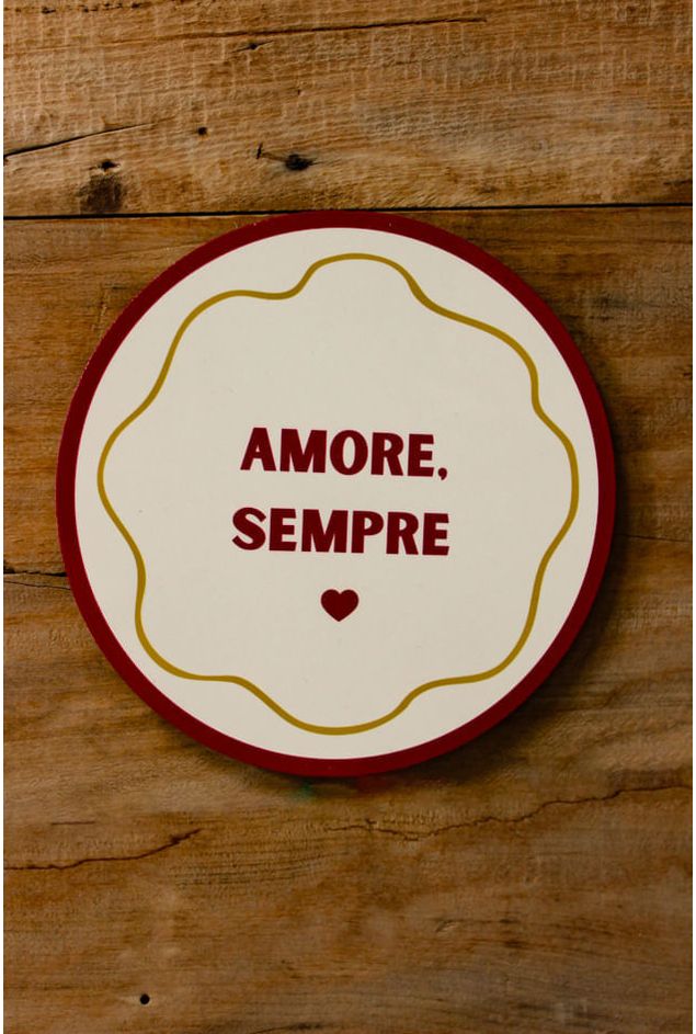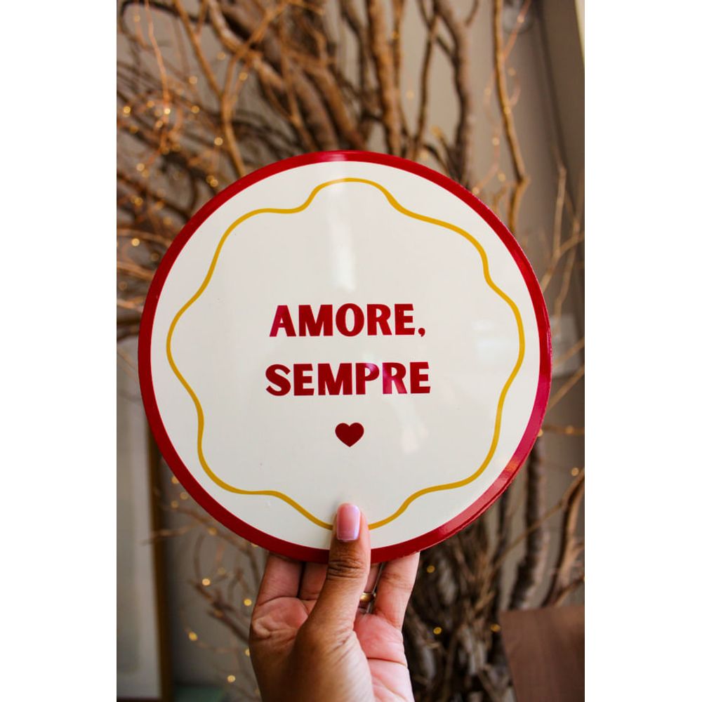 Azulejo decorativo com a frase (Amore sempre) traduzida em ame sempre. Uma peça em formato redondo e estilo delicado, e tons rosa e amarelo, para compor a decoração com charme e romantismo, seu design traz a moldura em cor rosa, o que destaca a frase central, que acompanha um mini coração rosa. Uma peça decorativa que reflete no sentimento para deixar o espaço mais bonito e autêntico.