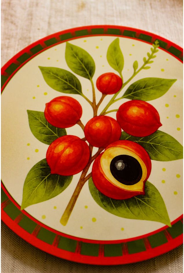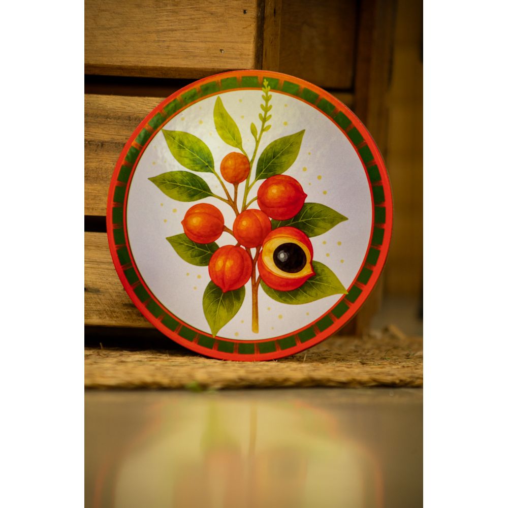 Azulejo decorativo em formato redondo, ilustrando o guaraná com seus frutos vibrantes e sementes marcantes, a representação da vitalidade e tradição brasileira, com suas folhagens em tom verde e moldura que se divide em cores escuras e quentes, a peça decorativa que vai irradiar em sua decoração de parede, a peça que faz parte da coleção brasilidades, um verdadeiro encanto da cultura brasileira.