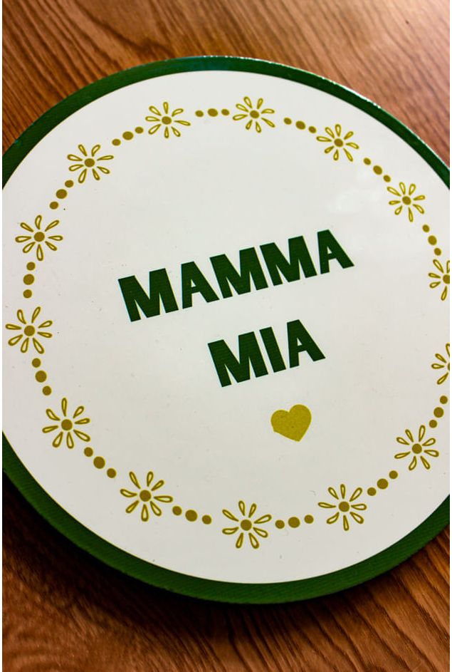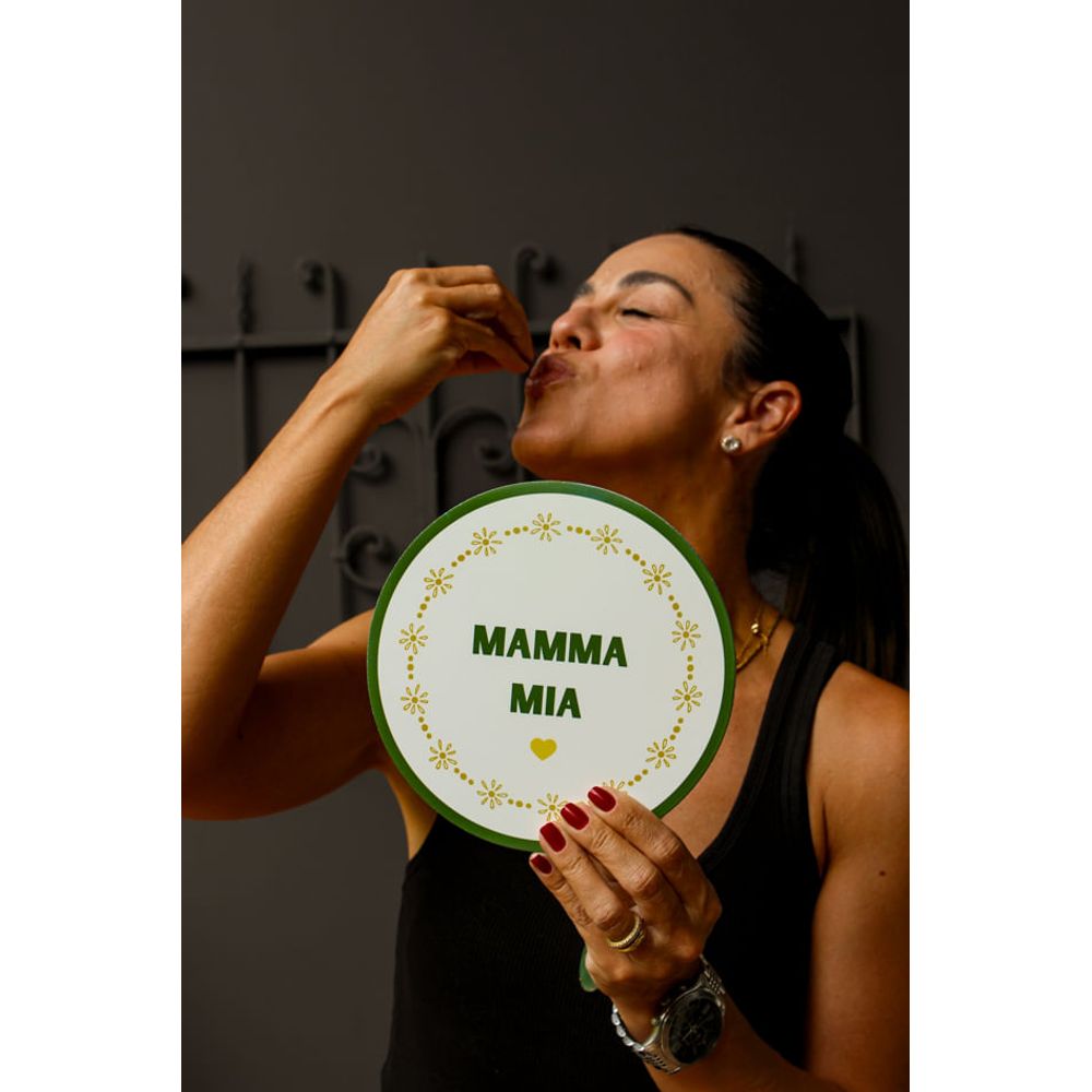 Azulejo decorativo em formato redondo, com a frase (Mamma mia), uma expressão italiana muito conhecia, com fundo claro e detalhes em verde, acompanhado de um mini coração, e detalhes florais, transmitindo leveza e elegância para a composição, a peça ideal para quem ama decoração com referência gourmet e italiana. Transforme a sua decoração ou presenteie alguém especial com este mimo.