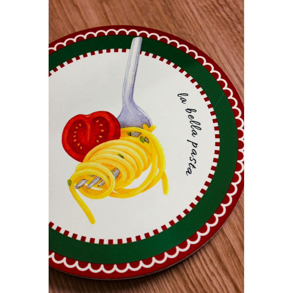 Azulejo decorativo em formato redondo, com a ilustração de uma deliciosa pasta o clássico macarrão, inspiração italiana, uma peça cheia de charme e cores que destaca o garfo enrolando o macarrão com tomates frescos, uma peça que traduz aquele clima irresistível de um jantar italiano. Com design marcante em cores e formas em vermelho e verde, com a frase (La bella pasta), traduzida em A bela massa.