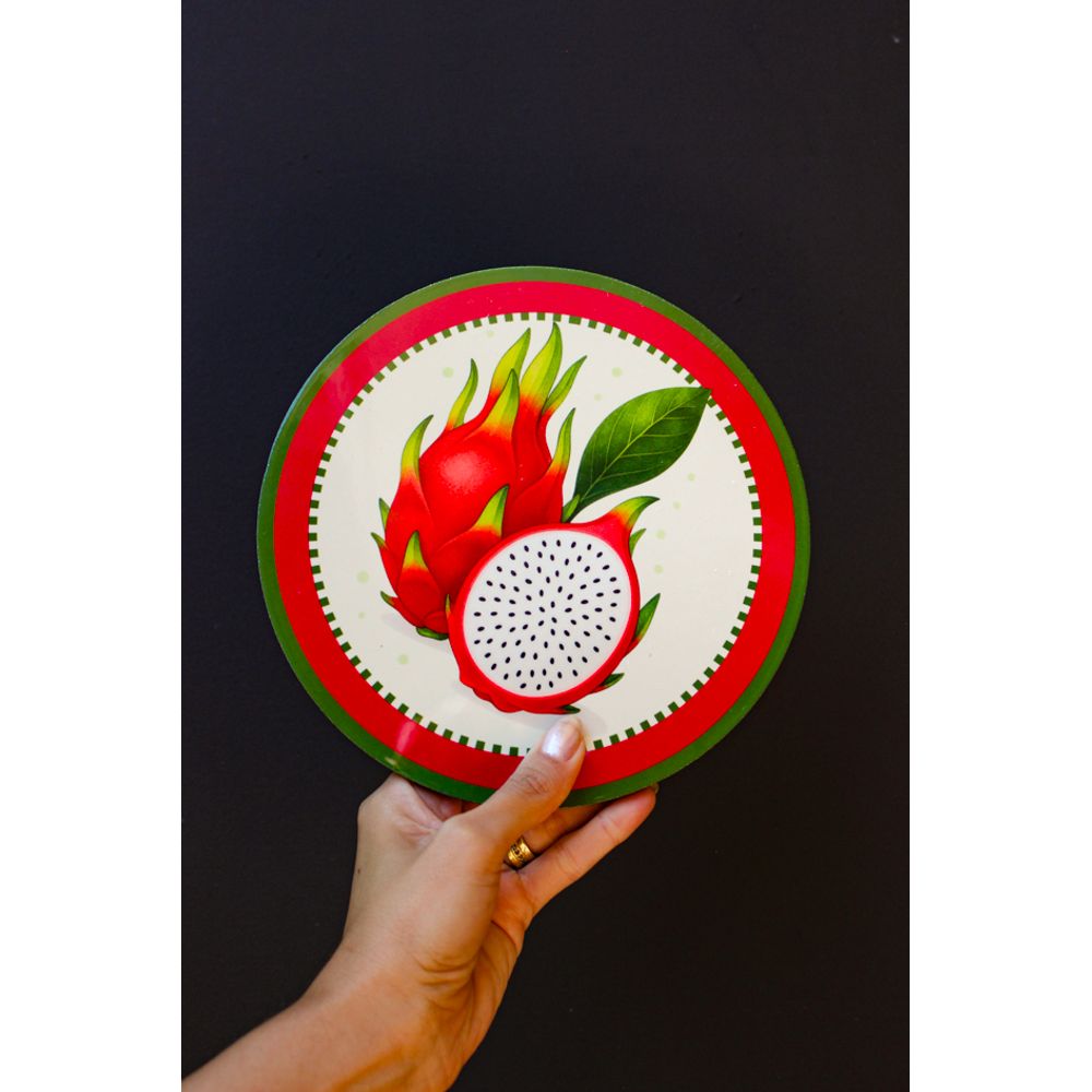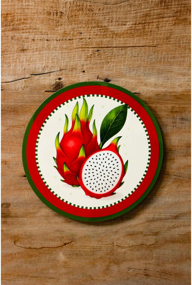 Azulejo decorativo redondo com a figura da bela fruta Pitaya, uma peça vibrante e cheia de personalidade para compor ambientes com cor e frescor, seus tons intensos entre o vermelho e o verde destacam a fruta com sua beleza exótica e marcante, a peça decorativa perfeita para quem deseja decorar com inspiração na natureza transmitindo leveza e beleza para a decoração.