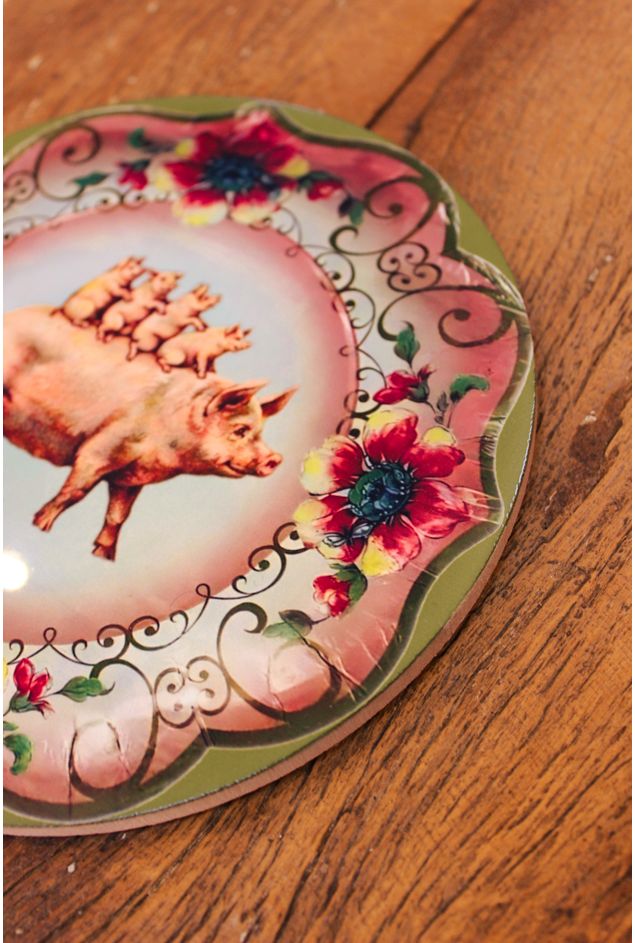Azulejo decorativo em formato redondo, feita pelo querido artista Greghi, em um design retrô que lembra antigas porcelanas ornamentadas. Com estampa de porquinhos, essa peça vem também para apaixonar os amantes dos animais. Super legal para compor o decor da sua parede seja na cozinha, sala ou quarto!