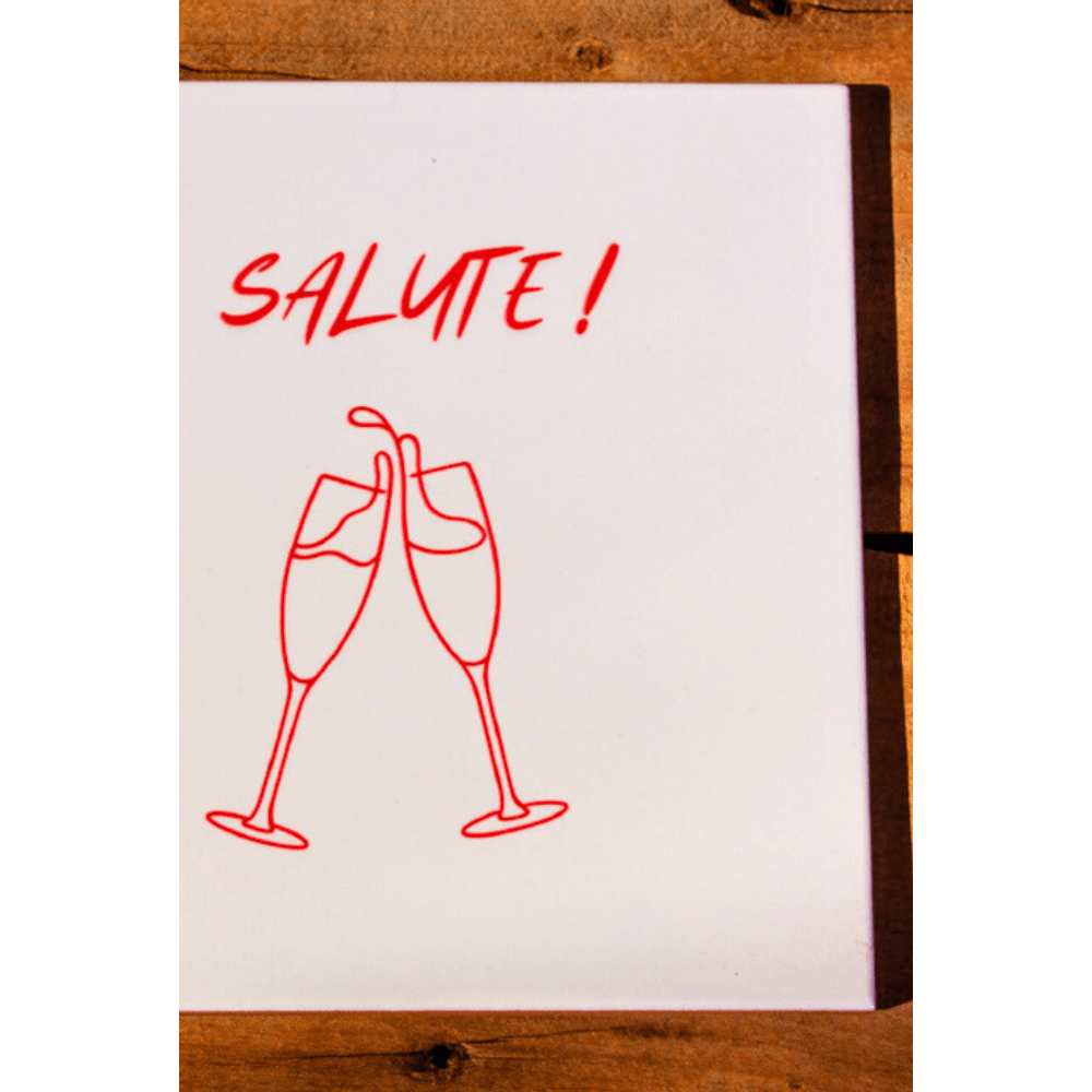 Azulejo decorativo com a palavra “Salute!” em vermelho, acompanhada da ilustração minimalista de duas taças brindando. Uma peça que celebra momentos especiais e a alegria de estar junto, trazendo um toque de descontração e elegância para a decoração.