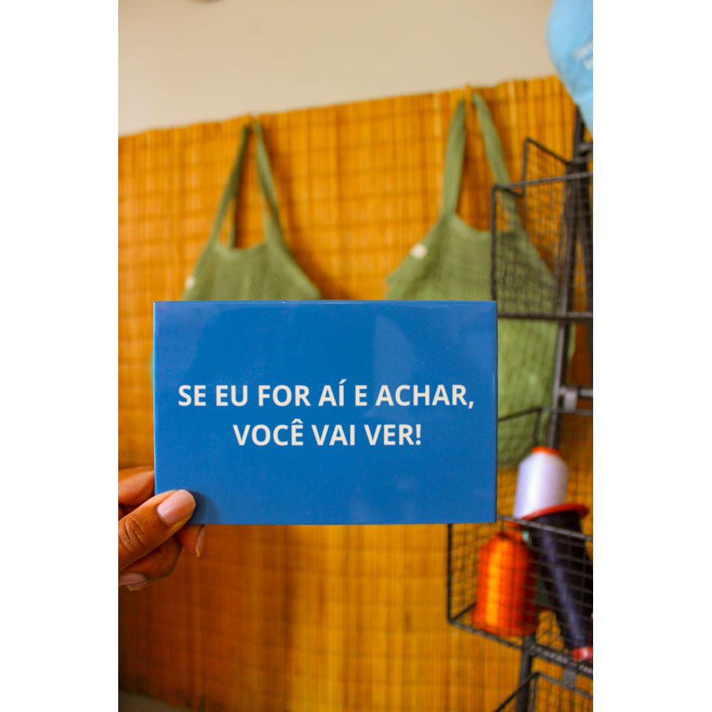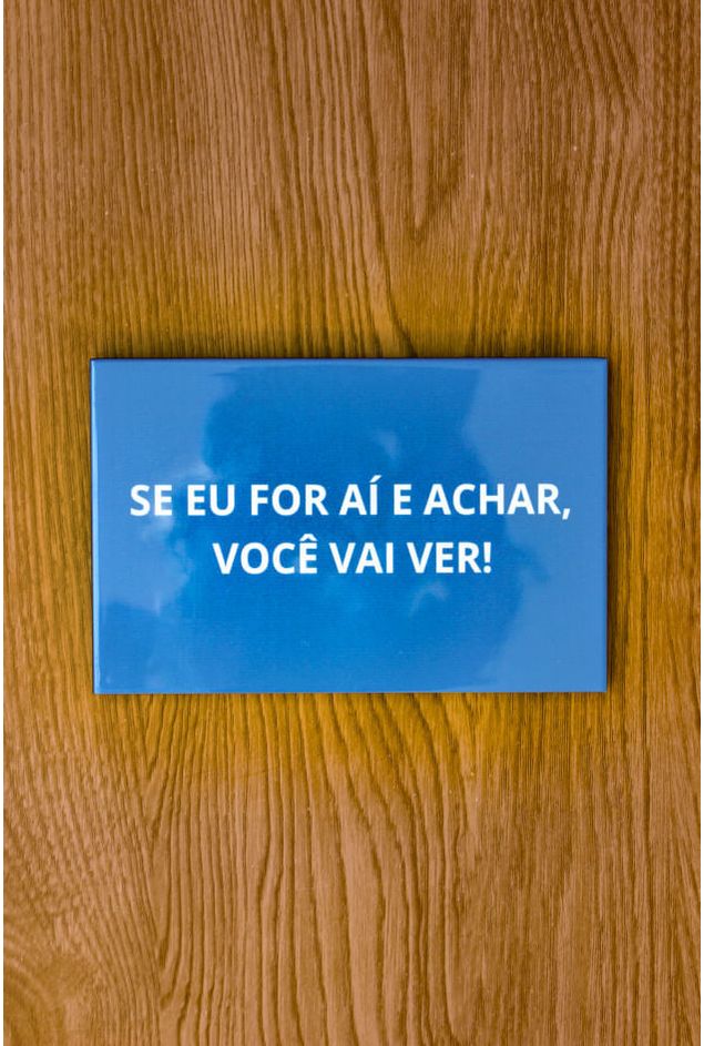 Azulejo decorativo com a frase (Se eu for aí e achar, você vai ver!). Uma peça bem-humorada e cheia de personalidade, inspirada em uma das chamadas que nos levam ao tempo, com fundo em azul marcante e letras em destaque, o azulejo transforma uma memória afetiva em decoração divertida, com leveza e personalidade. Perfeito para decorar ambientes com alegria e afeto, ou para presentear alguém que conhece bem esse tipo de ameaça que, no fundo, sempre vinha carregada de cuidado.