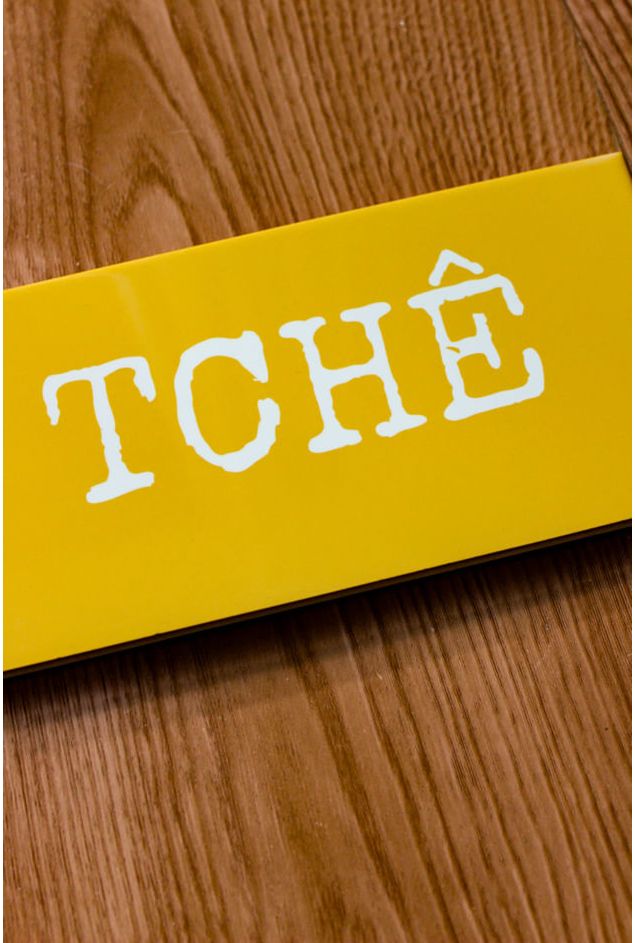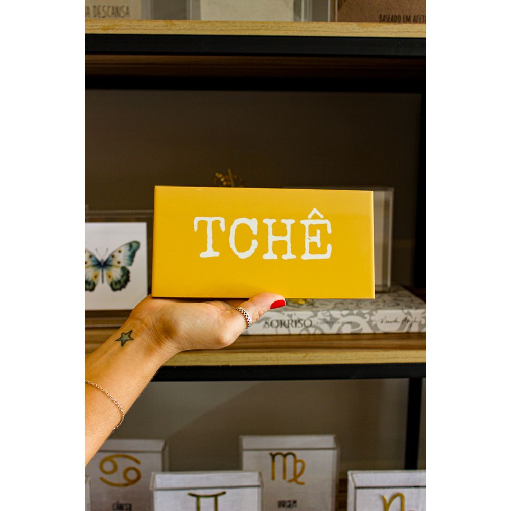 Azulejo decorativo com a palavra (Tchê), trazendo para a sua decoração cor e identidade brasileira, uma palavra usada frequentemente pelos gaúchos, em tom amarelo vibrante iluminando e adicionando um toque descontraído para a peça, o azulejo decorativo que traz memorias afetivas e praticidade para criar combinações de paredes.