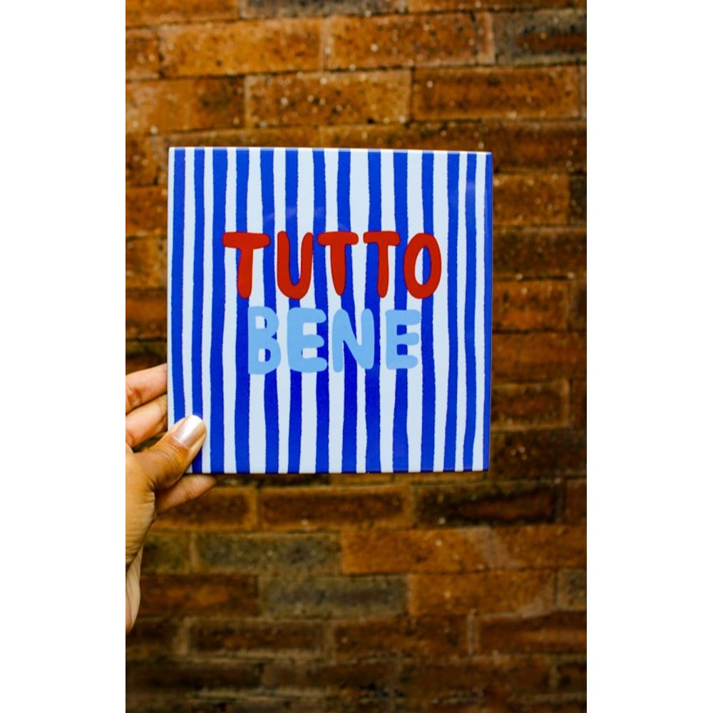 Azulejo decorativo com listras orgânicas em azul e a frase “Tutto Bene” em destaque. Da Coleção Vivere, essa peça da Mimo Galeria traduz o espírito leve e vibrante de quem vive com alegria, estilo e confiança no presente. Um toque de bom humor à italiana para espalhar beleza e boas vibrações pela casa.