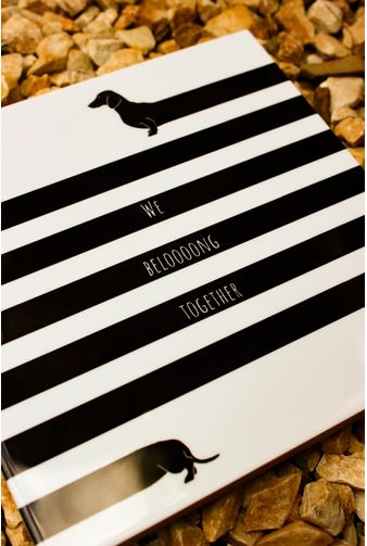 Azulejo decorativo com estampa divertida apresentando o famoso salsichinha, que se alonga em linhas pretas sobre o azulejo, a frase (We beloooong together) em letras brancas se realçam, traduzida em – Nós nos damos muito bem, celebrando a união e os bons momentos com aquela pessoa especial, uma obra artística divertida com design clássico, combinando com diversas decorações e ambientes descontraídos.