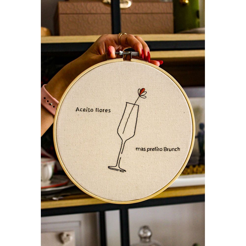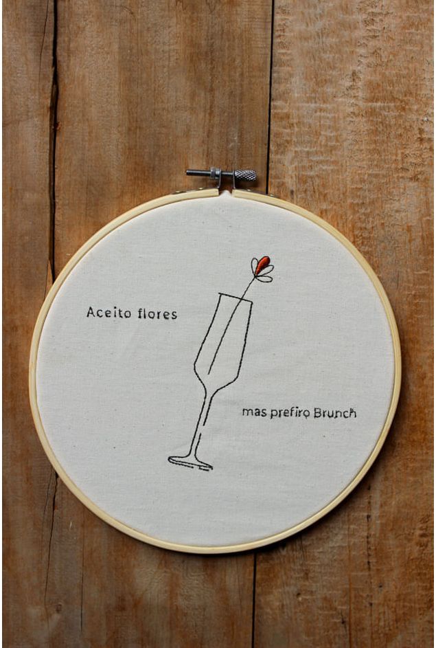 O bastidor bordado é uma delicada peça bordada a mão cheia de charme e humor, com a figura de uma taça com um ramo de flor inclinada, acompanhada da frase (Aceito flores, mas prefiro um brunch) com linhas em traços finos, sobre o tecido cru e borda em madeira pinus em tom claro, perfeito para quem aprecia pequenos detalhes e prazeres da vida. A peça ideal para decorar com estilo e poesia, lançamento mimo galeria mais do que uma simples decoração.