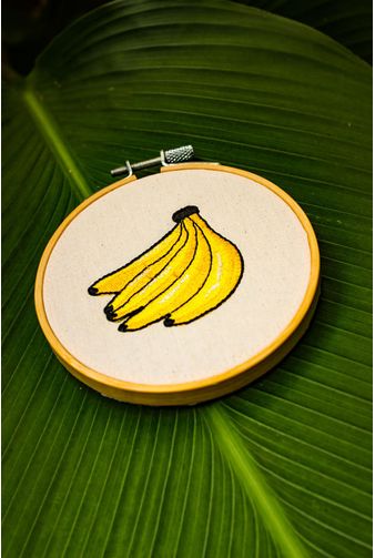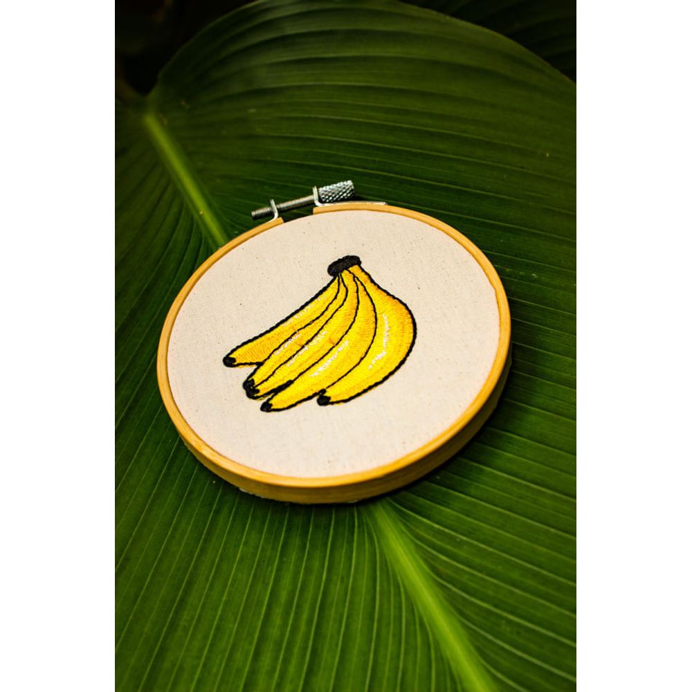 Bastidor com bordado delicado de bananas, um símbolo brasileiro que encanta com a sua cor e presença, com traços marcantes e cores vibrantes a peça decorativa se destaca em uma composição de parede, transmitindo alegria e personalidade para o ambiente com o charme do fruto.