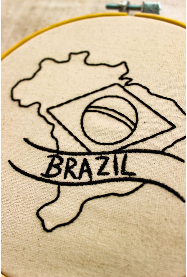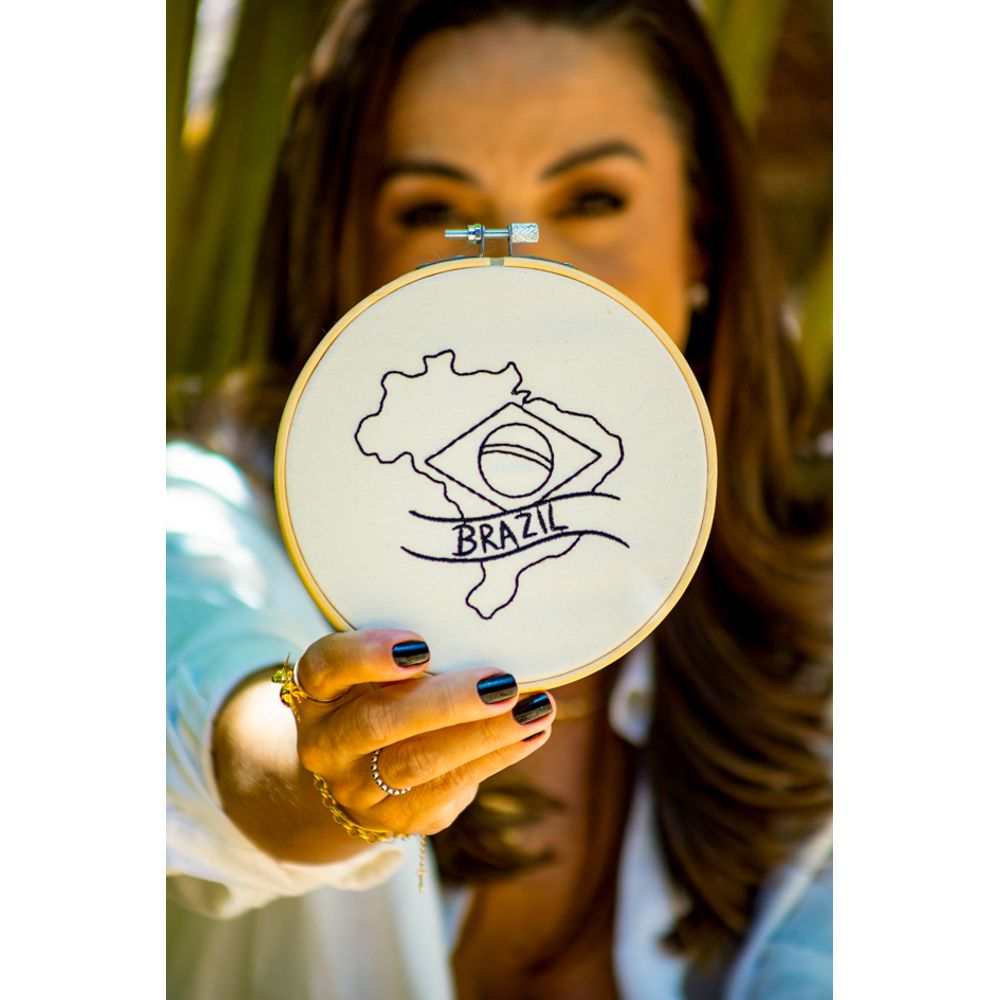 O bastidor bordado é uma delicada peça, que conta histórias por cada linha bordada do mapa do brasil, com traços minimalistas em linha preta e fundo neutro, a palavra (Brazil) se destaca e reforça a força e cultura, tornando a peça cheia de significado.
