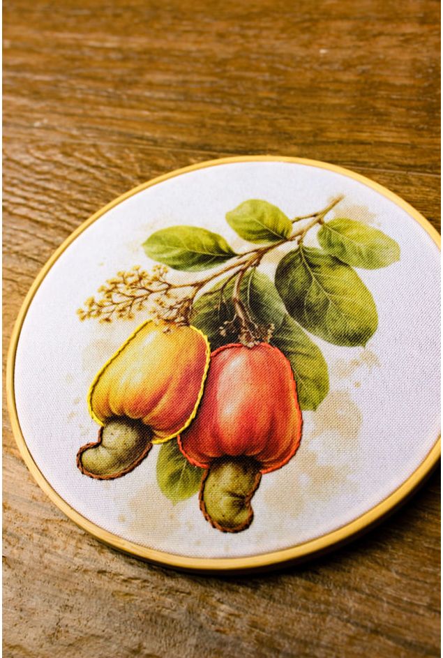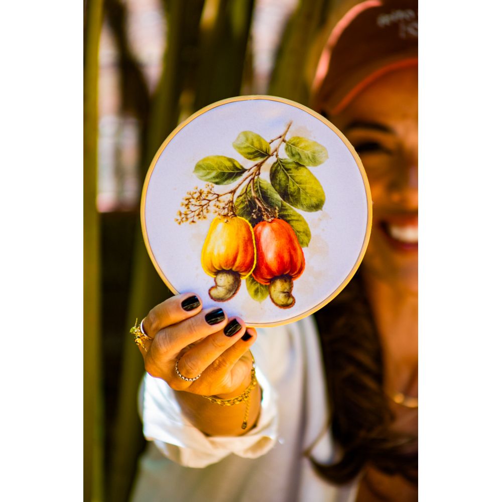 Bastidor decorativo que estampa a fruta caju pendurada direto do pé, com folhagens e bordado delicadamente em volta do fruto com pequenos pontos em amarelo e outro em laranja, uma figura tropical brasileira, que irradia beleza e sabor, a peça perfeita para pendurar em paredes como uma forma de identidade.