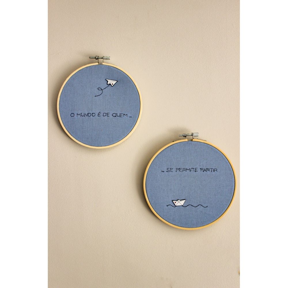 Duplo bastidor bordado com a frase (O mundo é de quem ... Se permite partir). Uma composição poética dividida em duas peças que se completam com delicadeza e sentido. Sobre o fundo azul suave, o bordado em traços finos encontra os pequenos barquinhos de papel. A frase fala sobre coragem de se abrir para novos caminhos, tornando este conjunto perfeito para decorar com profundidade e sutileza. Uma dupla especial para ambientes que pedem poesia e contemplação.