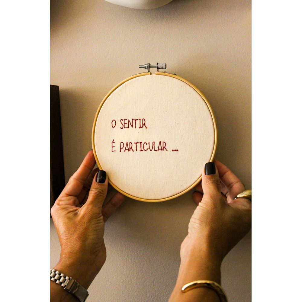 Bastidor bordado com a frase (O sentir é particular), uma frase profunda para nos lembrar do que mais importa, bordada sobre o linho, a frase aparece com delicadeza tornando a composição ainda mais sensível. Um bastidor que convida à pausa e de que cada emoção tem seu próprio tempo, peso e beleza. Perfeito para ambientes com alma, onde a decoração também pode ser uma forma de sentir.