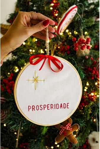 Bastidor bordado feito a mão com a palavra Prosperidade que se destaca em linha tom vermelho, sobre o tecido cru em linho, no canto superior uma linda estrela em pontos na cor dourado, uma delicada peça simbólica que celebra o natal com boas energias e para completar a obra artesanal, no topo contém o laço em fita vermelha, um enfeite encantador que transforma a peça, perfeita para presentear ou decorar portas e parede.