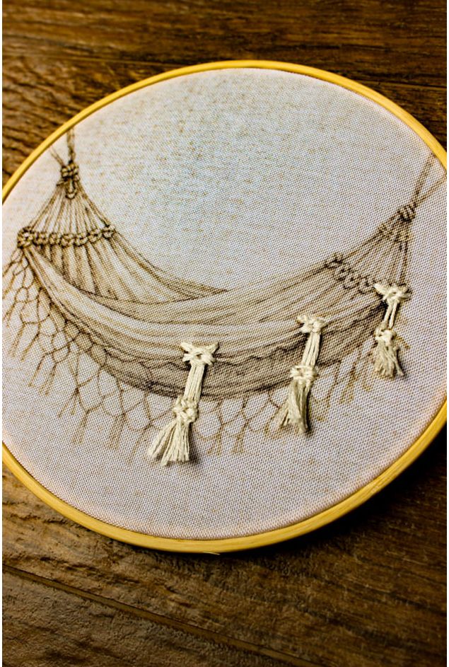 Bastidor decorativo que estampa uma rede de descanso, com bordado delicado representando os detalhes da rede que torna a peça ainda mais especial, o que traz o movimento para a decoração, o que traz na memória aqueles momentos de descanso e contemplação,