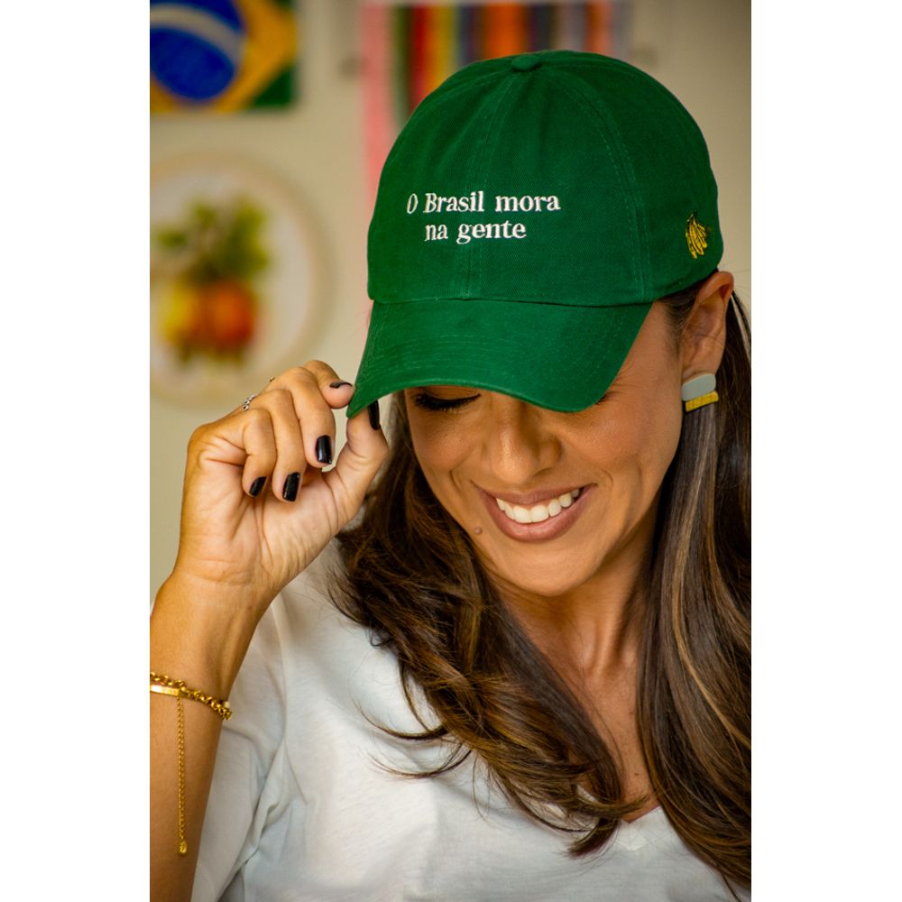 O boné (O brasil mora na gente), traz o delicado bordado da frase em cor branco, sobre o design em tom verde escuro, exaltando com elegância a origem e cultura brasileira, composto em tecido macio e leve, transmitindo frescor para dias quentes, além de uma aba com design curva e moldável proporcionando o ajuste e conforto ao logo do dia.