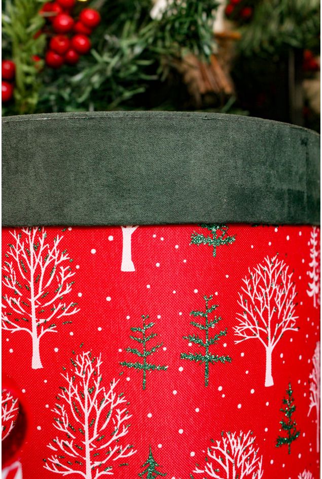 Caixa de presente de veludo no tamanho M, uma peça com acabamento repleto de detalhes, com estampa vermelha adornada por figuras de pinheirinhos branco e verde com brilho delicado e neve, caixa em tecido veludo, sua tampa em tom verde entrega o charme da peça, ideal para presentear com estilo e afeto ou decorar ao lado da árvore de natal, uma peça super versátil. Transforme sua decoração com o destaque da caixa de presente ou presenteie alguém especial, com a magia de natal.