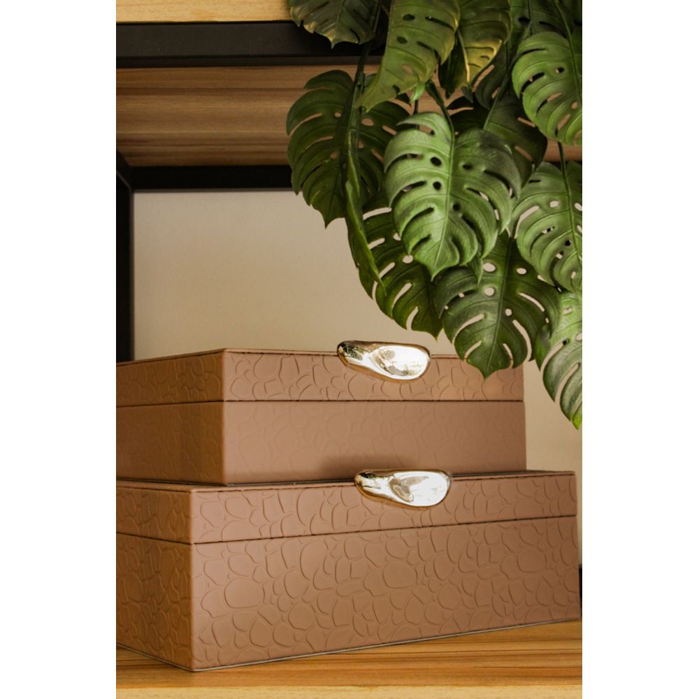 A caixa decorativa com textura é uma peça elegante que une beleza e praticidade, seu acabamento possui texturas e tom nude no tamanho P, o que se destaca além do design moderno são as alças de abertura em dourado, adicionando um toque de luxo para a caixa rica em detalhes.