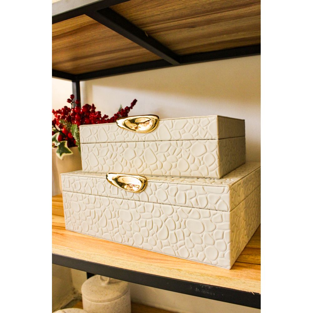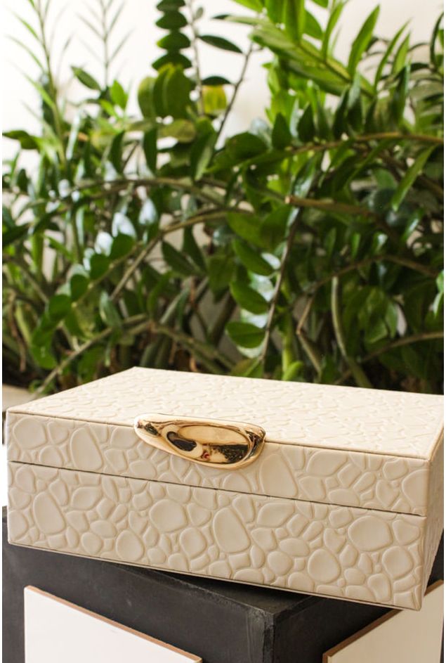 Caixa decorativa com textura, uma peça elegante rica em detalhes, unindo beleza e praticidade, seu acabamento possui texturas e tom off white, caixa no tamanho P, sua alça de abertura se destaca no tom dourado, o que transmite luxuosidade para a peça. Transforme ambientes com a caixa decorativa off white.