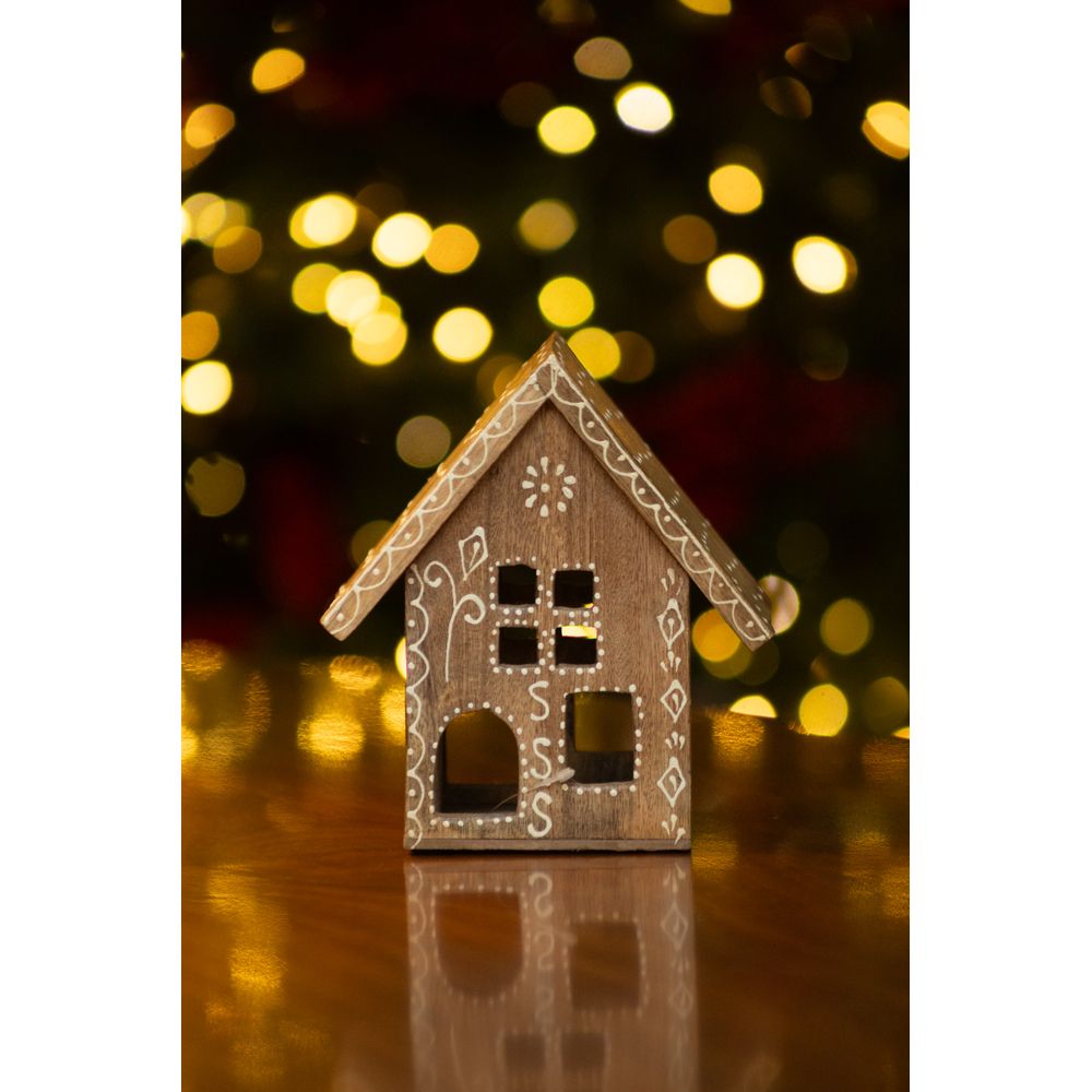A casinha decorativa de madeira é uma peça que nos lembra as bolachinhas de natal com seus detalhes de figuras em branco pintadas a mão, torneando a peça, uma obra artística rústica que nos revelam memórias afetivas e aconchego, composta por madeira natural combinando com diversas composições natalinas, como árvores de natal e luzes, ideal para decorar mesas festivas e aparadores, além da decoração do cantinho de natal.