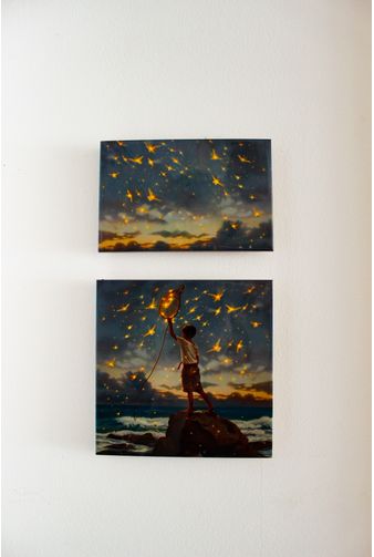 Conjunto de azulejos decorativos feito pelo Greghi, de um menininho na ponta de uma pedra em frente ao mar, segurando uma rede, enquanto uma chuva de vagalumes completam o céu e transformam a paisagem.