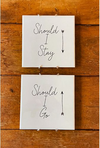 Conjunto de azulejos brancos, estampados em um processo artístico feito totalmente por nós da Mimo! Inspirado em um amor em comum pela música, criamos a coleção chamada "músicas na parede", que traz uma linha de azulejos divertidos e inspiradores das nossas músicas preferidas! Nesse, temos a frase "Should I Stay" e "Should I Go", da clássica música "Should I stay or should I go" do The Clash. Um sucesso de décadas em um espacinho da sua parede!