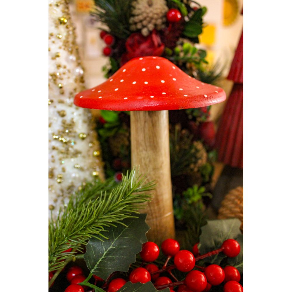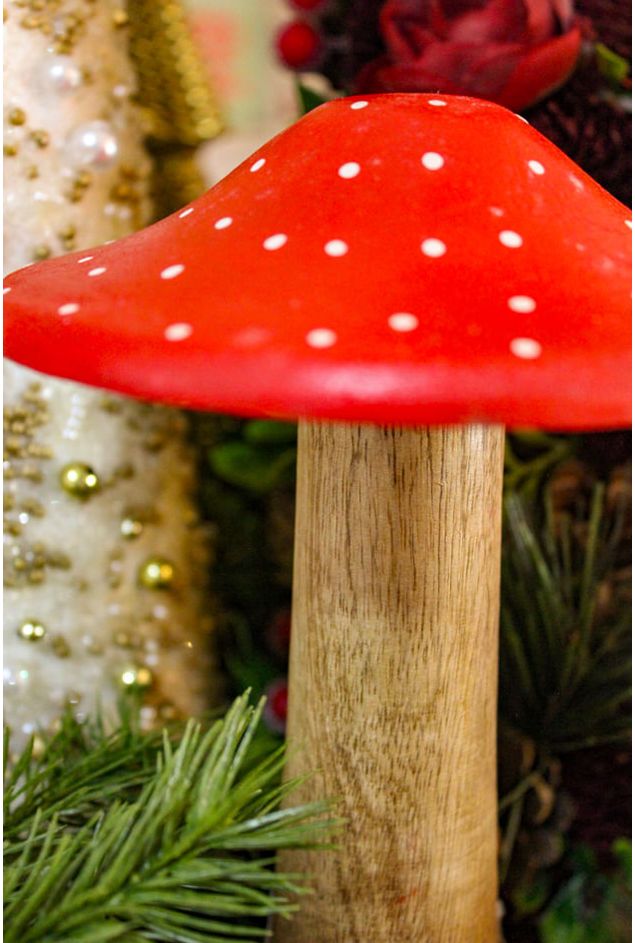 O cogumelo decorativo no tamanho g é uma delicada e encantadora peça artesanal, refletindo um toque de cor e diversão para a sua decoração, seu design rústico combina perfeitamente com decorações natalinas harmonizando os tons e transformando decorações em um verdadeiro cenário de contos de fadas, feito em madeira natural com pintura em vermelho e bolinhas brancas no topo.