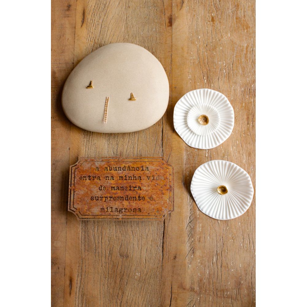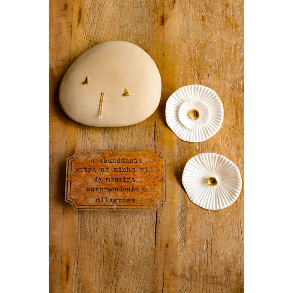 Uma linda combinação de parede serena e harmônica, conectando o natural e o sagrado. A escultura de parede mundinho encontro é uma peça em cerâmica banhada a ouro, evocando beleza em cada detalhe, com formas e leveza. Enquanto o quadro etiqueta em ferro envelhecido com a frase (A abundância entra na minha vida de maneira surpreendente e milagrosa), transmite fé e gratidão, e para completar com requinte e delicadeza as esculturas flores imaginárias vem com elegância e poesia, com seus detalhes banhados a ouro e relevo dando movimento para a peça. Uma combinação rica em prosperidade e gentileza, que traz a transformação para a sua decoração enchendo o ambiente de boas energias e poesia.