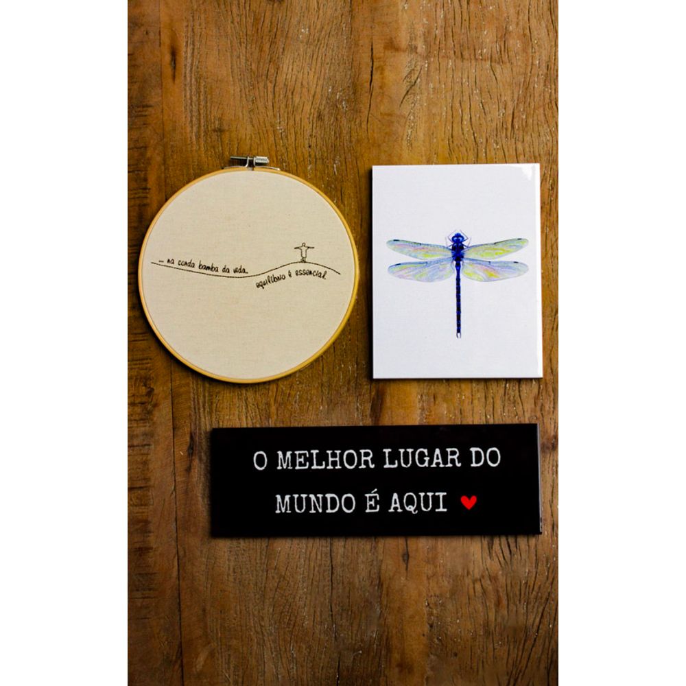 Combinação de parede composta por arte, frases e texturas diferentes, o bastidor bordado se destaca por seu bordado a mão, com uma frase essencial. O azulejo decorativo nos inspira com sua frase que entrega aconchego por onde é exposta. O azulejo com aplicação de uma linda libélula, rica em detalhes. Perfeito para presentear ou compor paredes.