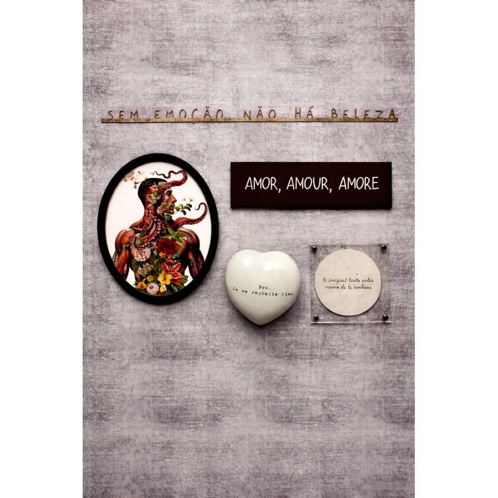 Economia de R$ 178,90Combinação de parede que une intensidade e modernidade, composta por diversos produtos com texturas e cores diferentes. O quadro em formato oval transmite a arte anatômica com flores e personalidade com moldura em tom preto, já a frase garimpada em ferro equilibra a estética do garimpo com afeto, (Sem emoção não há beleza), enquanto o azulejo decorativo com a frase (Amor, amour, amore), dedica afetos, a escultura em porcelana com formato de coração encanta com a frase (Non, Je Ne Regrette Rien), traduzida em “Eu não me arrependo de nada”, o quadro em acrílico com tecido bordado transmite a frase, (Te imaginei tanto antes mesmo de te conhecer). Uma composição rica em beleza e significado para a sua parede.